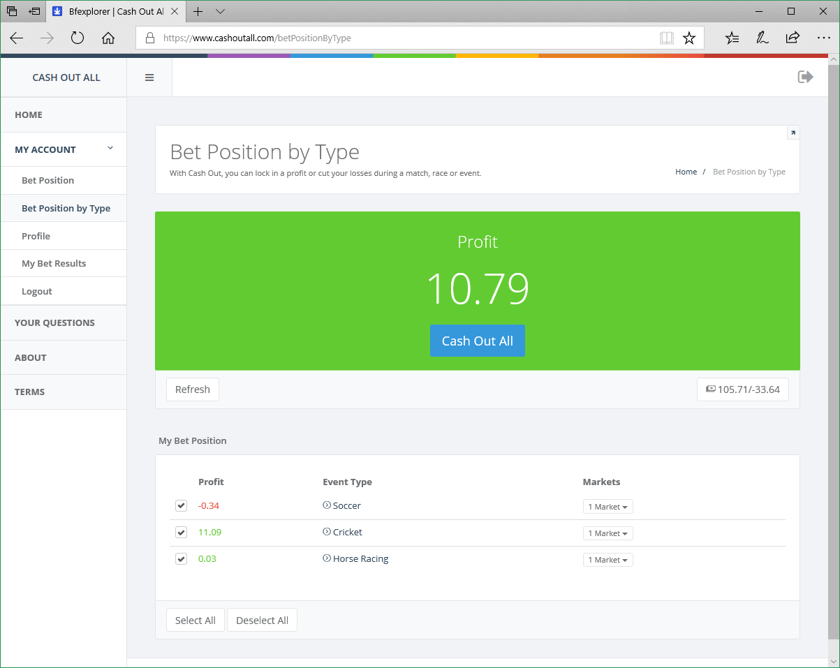"Cash Out All" markets is a very simple application that allow an overview of all Betfair Exchange markets in which you have open positions.